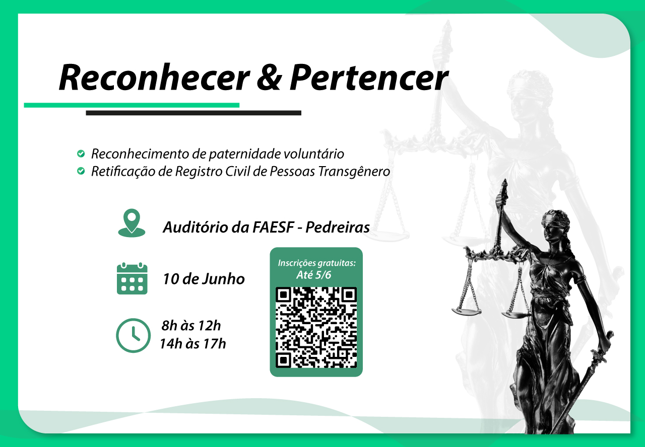 O Tribunal de Justiça do Maranhão (TJMA) e a Faculdade de Educação São Francisco (FAESF) irão promover em Pedreiras, no dia 10/6, o projeto de extensão universitária Reconhecer & Pertencer, no auditório da instituição de ensino, na Rua Abílio Monteiro, n.º 1736, Centro. O intuito do evento é garantir o direito à identidade e à cidadania.