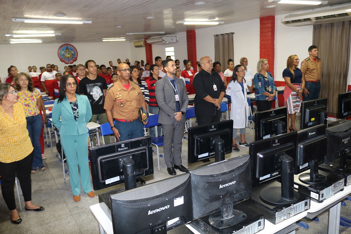 Estudantes da Escola Militar do Corpo de Bombeiros Militar do Maranhão (Vila Palmeira) participaram nesta sexta-feira (13) de solenidade de entrega de 20 computadores objeto de doação do Poder Judiciário, por meio da Corregedoria Geral da Justiça, para melhoria na estruturação da escola. A entrega foi feita pelo diretor da CGJ-MA, juiz Marcelo Moreira – representando o corregedor-geral da Justiça, desembargador Marcelo Carvalho Silva - com a participação do diretor do Colégio, Cel. Arnaldo Macedo, do diretor de Ensino da instituição, Cel. Figueiredo, da professora Tiane Chaves e da presidente do Colegiado, Nijelza Paula Costa.