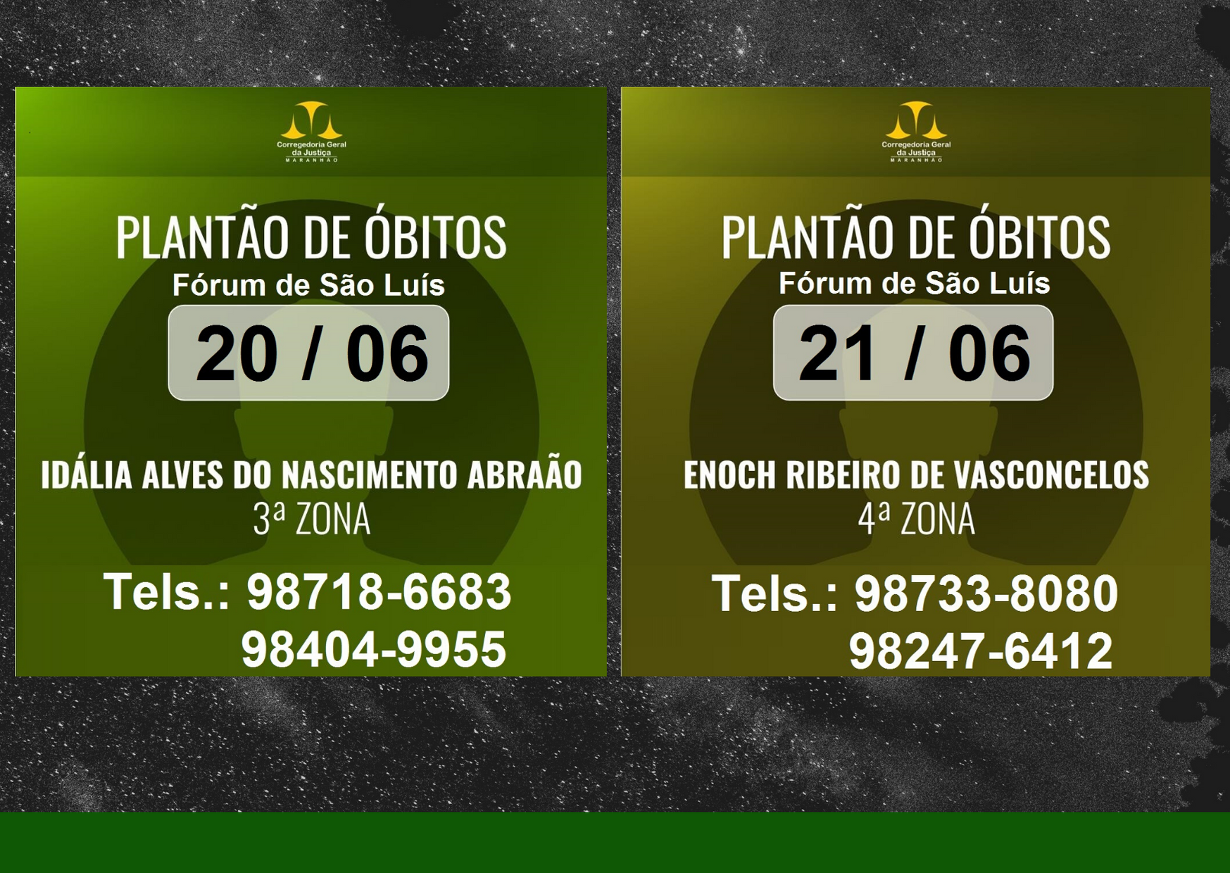 A emissão de Certidão de Óbito em São Luís funciona em regime de plantão neste fim de semana (20 e 21), no Fórum Desembargador Sarney Costa, excepcionalmente das 07h às 18h. No sábado, o responsável pelo serviço é o Cartório da 3ª Zona, telefone: (98) 98718-6683 e 98404-9955. No domingo, o plantão fica por conta do Cartório da 4ª Zona, telefone: (98) 98733-8080/98247-6412.
