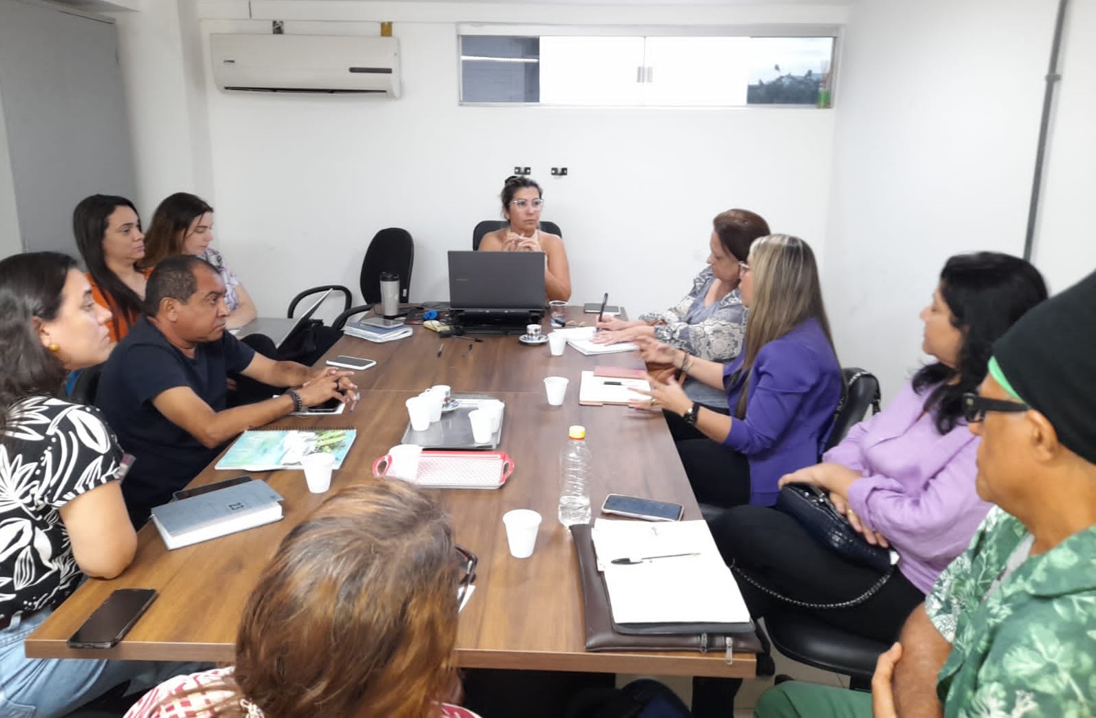 participam de reunião com a secretária Lúcia Marques, da SEMCAS (ao centro).