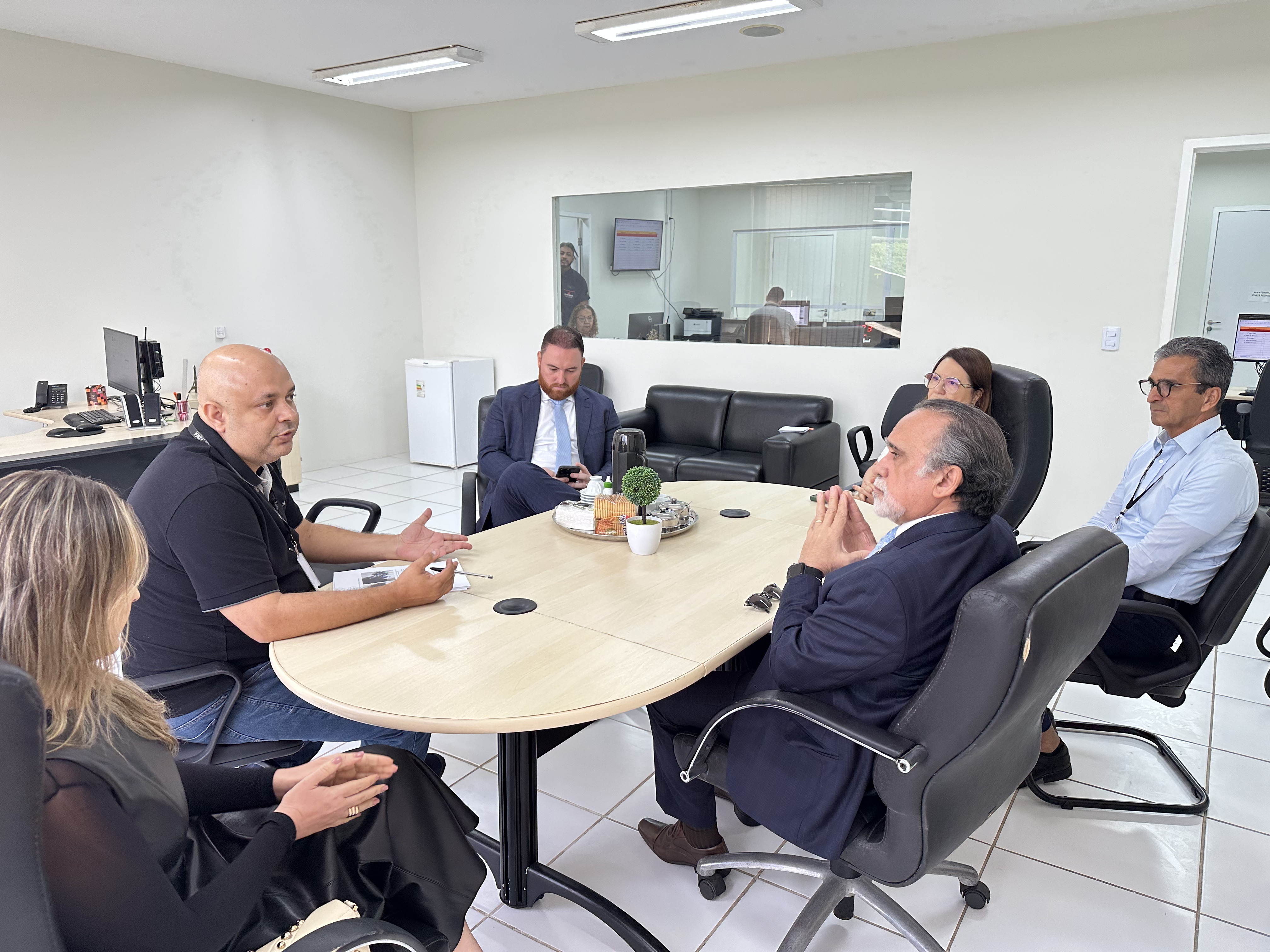 Participaram da reunião: a juíza Andréa Perlmutter Lago, diretora do Fórum Desembargador Sarney Costa; Carlos Izone de Carvalho, coordenador administrativo do Fórum de São Luís; Mário Lobão, secretário da Diretoria da CGJ; e Allana Prazeres, chefe de gabinete do corregedor.