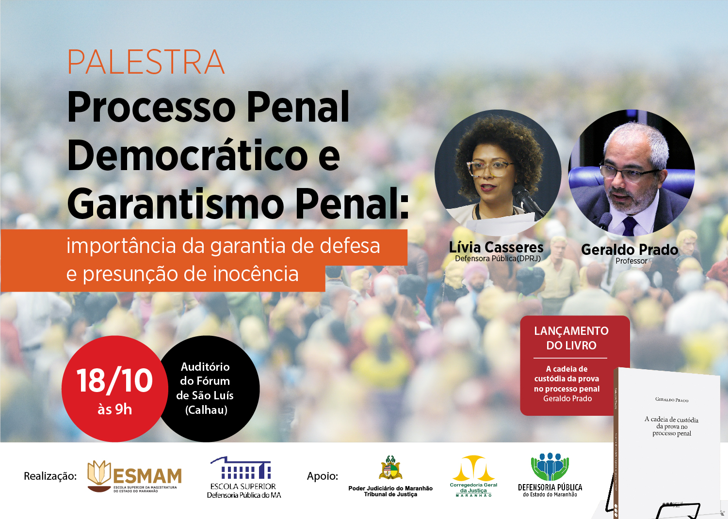 O combate aos mecanismos violadores de garantias fundamentais e constitucionais - como presunção de inocência e direito de defesa - serão tema da palestra Processo Penal Democrático: Garantismo Penal e Importância da Garantia de Defesa e de Presunção de Inocência, que será realizada no dia 18 de outubro, às 9 horas, no auditório do Fórum de São Luís (Calhau), com participação da defensora pública Lívia Casseres (DP-RJ) e do professor e jurista Geraldo Prado.