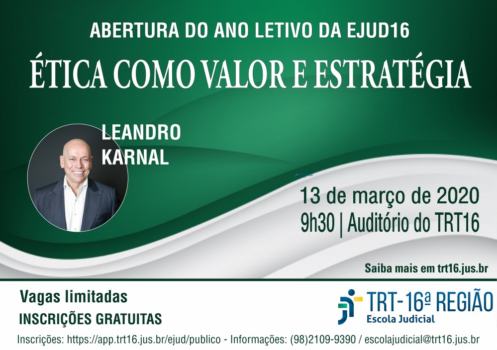 A Escola Judicial do Tribunal Regional do Trabalho da 16ª Região (EJUD 16) convida magistrados e demais servidores do Tribunal de Justiça do Maranhão (TJMA) para a palestra aberta Ética como Valor e Estratégia, com o historiador, professor e escritor Leandro Karnal. O evento integra a programação de abertura do ano letivo da instituição e será realizada no dia 13 de março, às 9h30, no Auditório Ari Rocha, na sede do TRT16 (Av. Senador Vitorino Freire, Nº 2001, Areinha - São Luís - MA).
