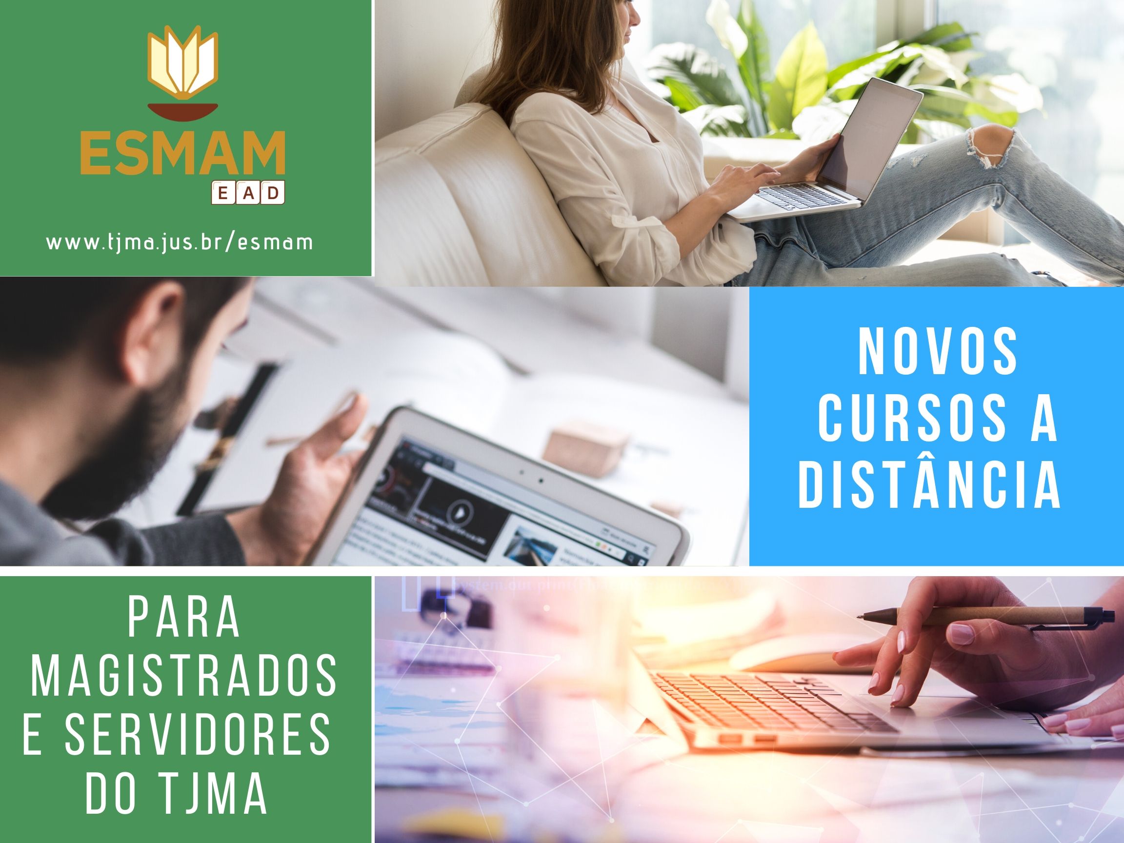Quatro cursos estão em andamento na plataforma de educação a distância da Escola Superior da Magistratura do Maranhão (EAD-ESMAM). Magistrados e servidores do TJMA participam das aulas em salas virtuais dos cursos de Formação de Tutores no Contexto da Magistratura (40 horas), Formação de Tutores no Contexto do Poder Judiciário (40 horas), Depoimento Especial de Crianças e Adolescentes e Gestão de Pessoas (30 horas).