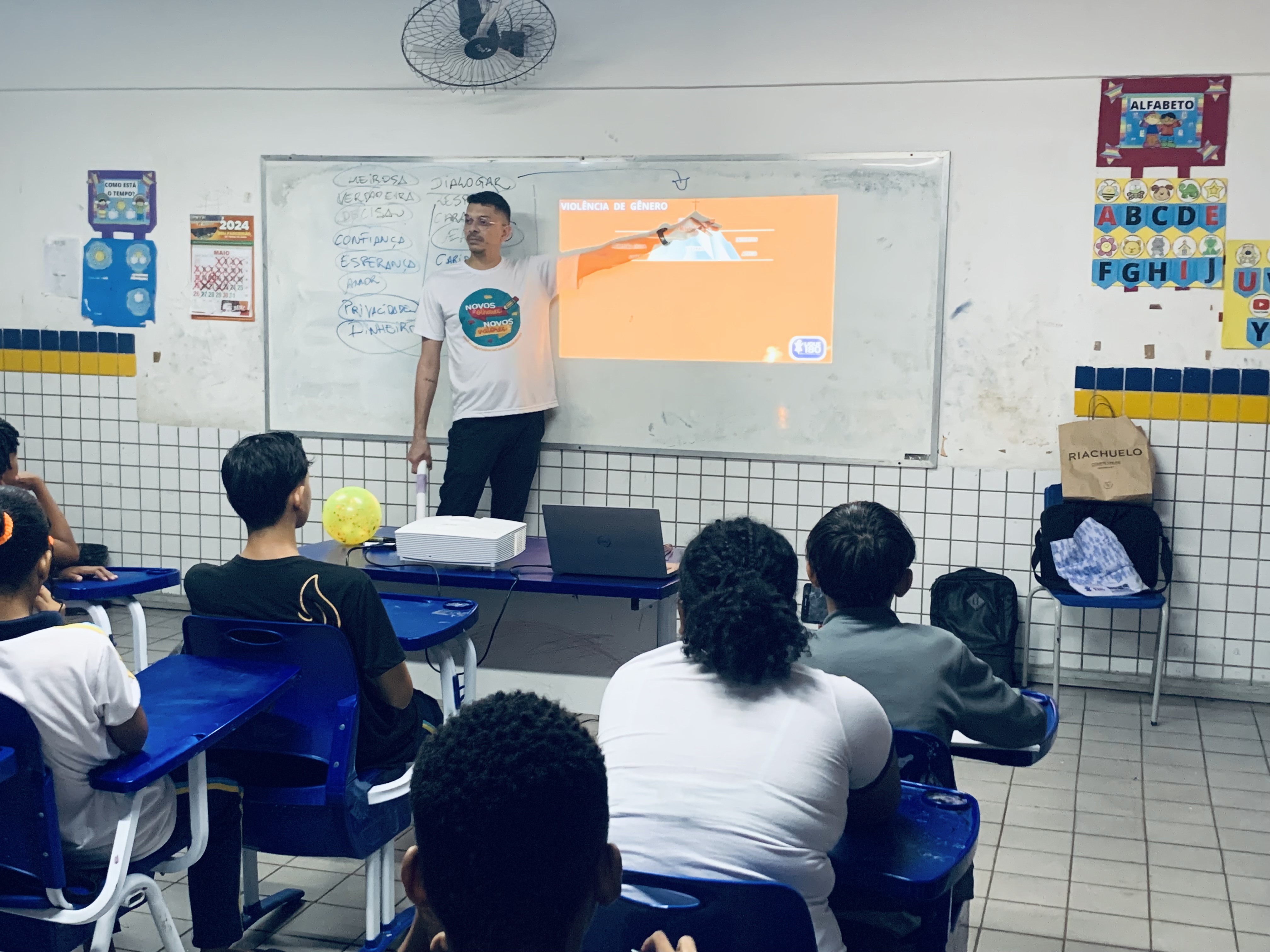Durante a atividade realizada na escola, foi promovida uma roda de diálogo sobre desigualdade de gênero, violência doméstica e familiar, relacionamentos abusivos, bem como maneiras para combater essas questões.