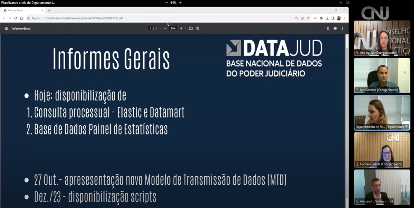 O primeiro evento foi realizado na última sexta-feira, 20 de outubro, pelo Cisco webex Meetings e nele foi apresentado a nova ferramenta que auxiliará na análise dos dados dos Tribunais.  A gravação será disponibilizada em breve.