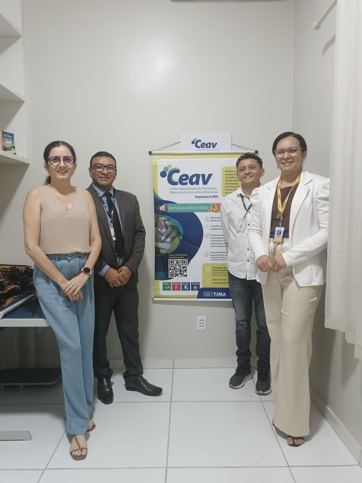 Estiveram presentes Lauber Queiroz, coordenador do CEAV; Jarbas Inácio, auxiliar judiciário; e Lilian Rolim Figueiredo, assistente social da Casa da Mulher Maranhense (Comarca de IMPERATRIZ). Pela FEST, participaram a Profa. Paula Regina Dias, gestora do EMAJ/FEST, e o Prof. Edivaldo Pinheiro, gestor da Clínica de Psicologia.
