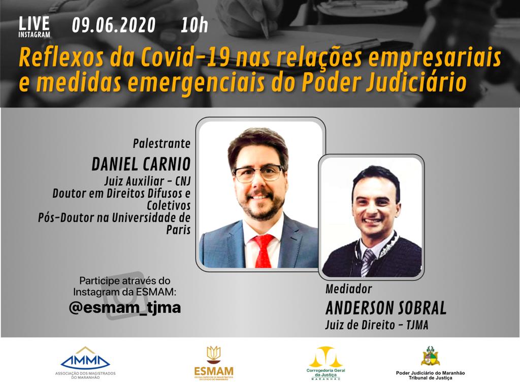 O juiz Daniel Carnio Costa, auxiliar do Conselho Nacional de Justiça (CNJ), é o nosso convidado para a série de lives do perfil @esmam_tjma, no Instagram, dia 9 de junho (terça-feira), às 10 horas. A convite da Escola Superior da Magistratura do Maranhão, o jurista, professor do departamento de direito comercial da PUC/SP, doutor em Direitos Difusos e Coletivos, com pós-doutorado pela Universidade de Paris, abordará sobre os Reflexos da Covid-19 nas Relações Empresariais e Medidas Emergenciais do Poder Judiciário. O juiz Anderson Sobral (TJMA) participará da palestra como mediador.