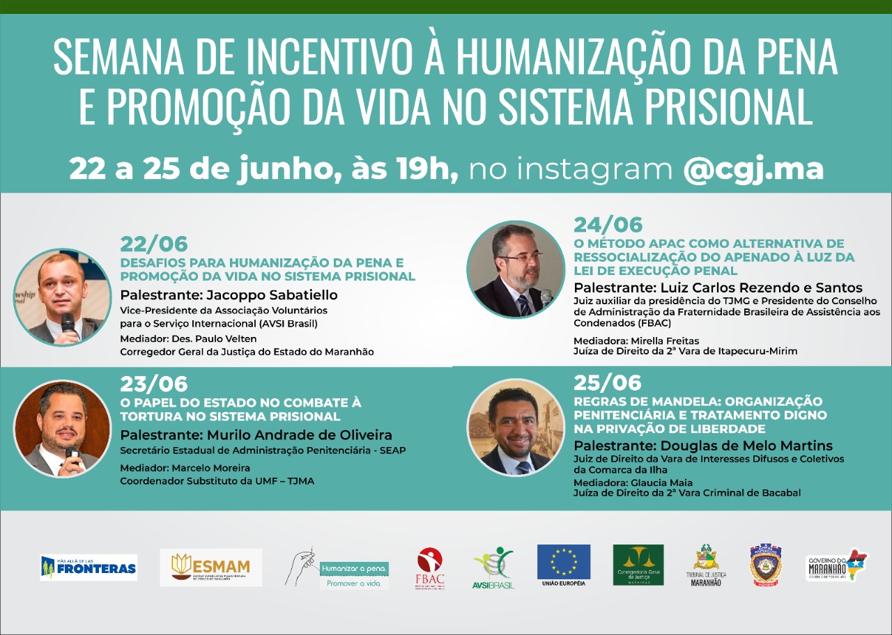Será realizada, de 22 a 25 de junho, a “Semana de Incentivo à Humanização da Pena e Promoção da Vida no Sistema Prisional”, com palestras ao vivo (lives) no instagram da Corregedoria-Geral da Justiça (@cgj.ma). A ação é alusiva à passagem do dia “Dia Internacional em Apoio às Vítimas da Tortura” - 26 de junho, instituído pela ONU.