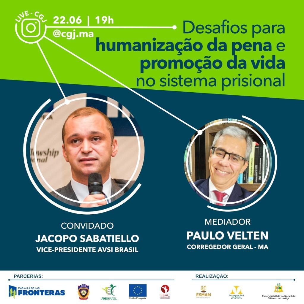 Às 19h, o corregedor-geral da Justiça, desembargador Paulo Velten Pereira, mediará a live “Desafios para humanização da pena e promoção da vida no sistema prisional”, tendo como convidado o presidente o vice-presidente da Associação Voluntários para o Serviço Internacional (AVSI Brasil), Jacopo Sabatiello.