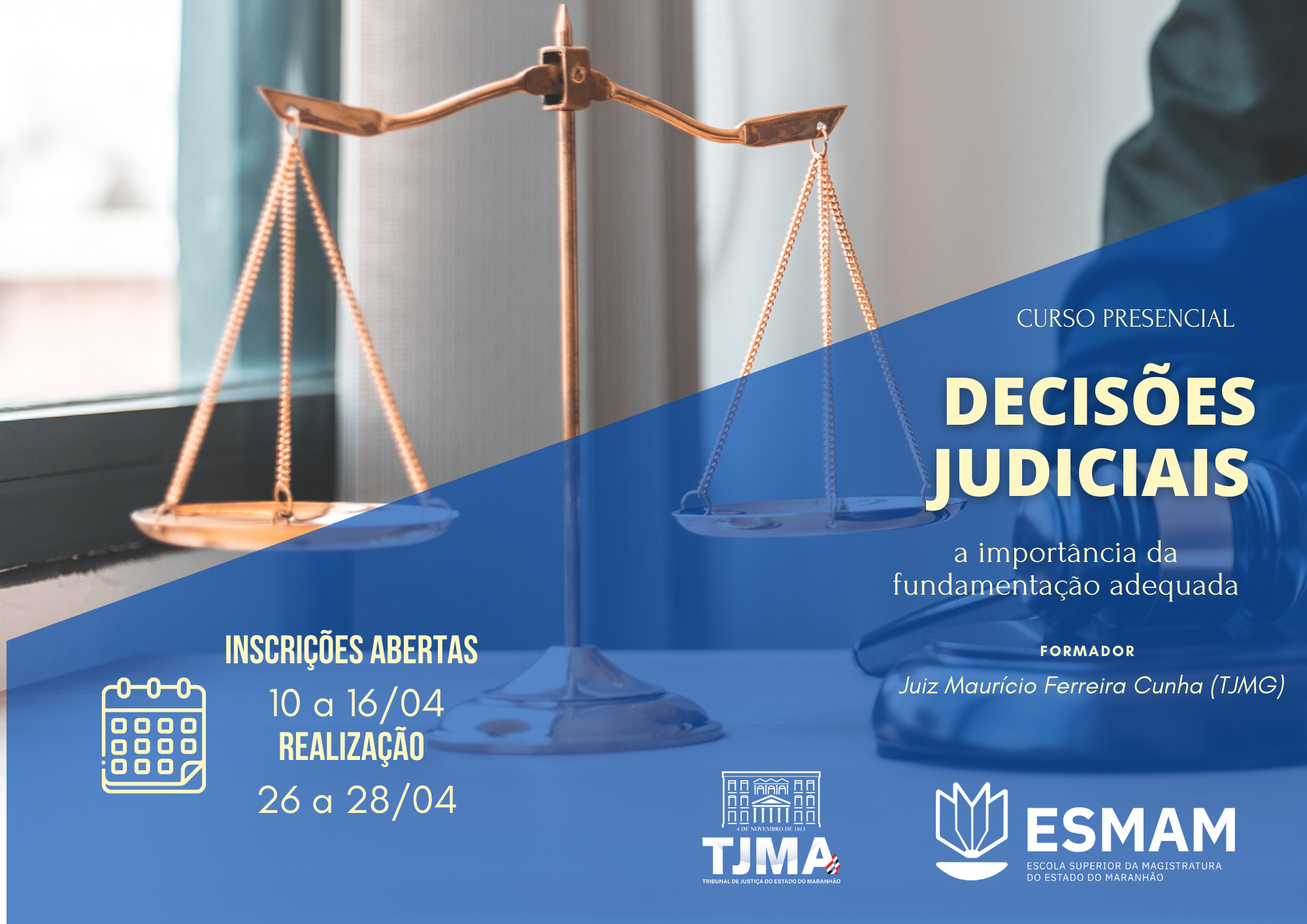 A importância da fundamentação adequada das decisões judiciais será tema do próximo curso para magistrados e magistradas do Tribunal de Justiça do Maranhão (TJMA). A formação será ofertada na modalidade presencial, de 26 a 28 de abril, na sede da Escola Superior da Magistratura (ESMAM), com 20 horas de duração, das 8h às 12h30 e das 14h às 18h. As inscrições estão abertas até 16 de abril, no sistema acadêmico Tutor.