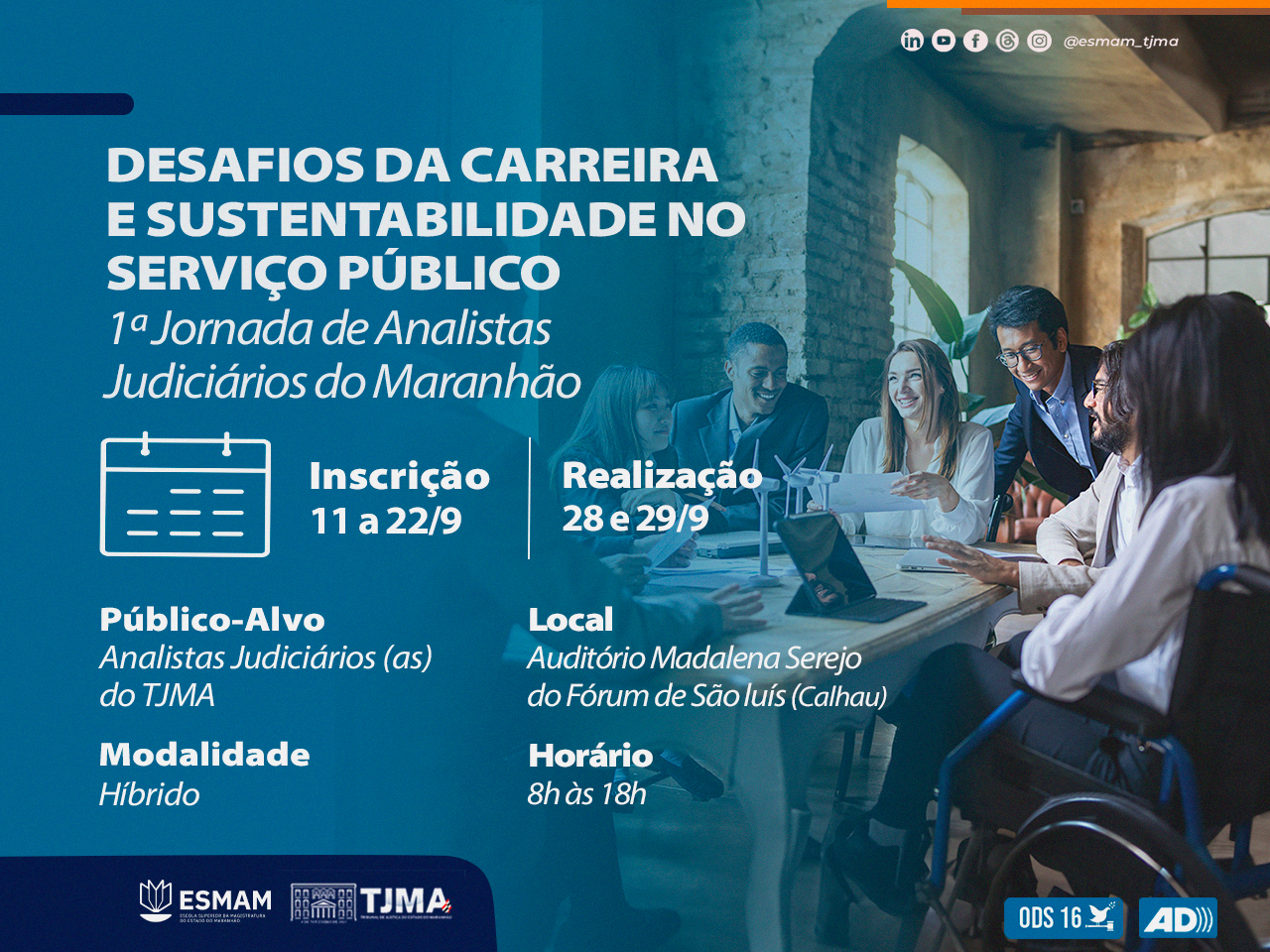 Profissionais de nível superior que atuam nas áreas especializadas da Justiça estadual promovem, nos dias 29 e 30 de setembro, a I Jornada de Analistas Judiciários(as) do Maranhão. O evento, alusivo ao Dia do Analista Judiciário – comemorado no dia 28 de setembro -, acontecerá no Auditório Madalena Serejo, no Fórum de São Luís (Calhau).