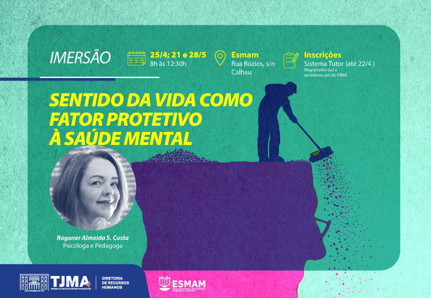 O Tribunal de Justiça do Maranhão (TJMA), por meio da Diretoria de Recursos Humanos (DRH), realiza nos dias 25/4; 21/5 e 28/5/24 a Imersão “Sentido da vida como fator protetivo à saúde mental”, na Escola Superior da Magistratura do Maranhão (ESMAM). O período de inscrição vai até dia 22 de abril, via Sistema Tutor. São disponibilizadas 15 vagas aos magistrados (as) e servidores (as) do PJMA.