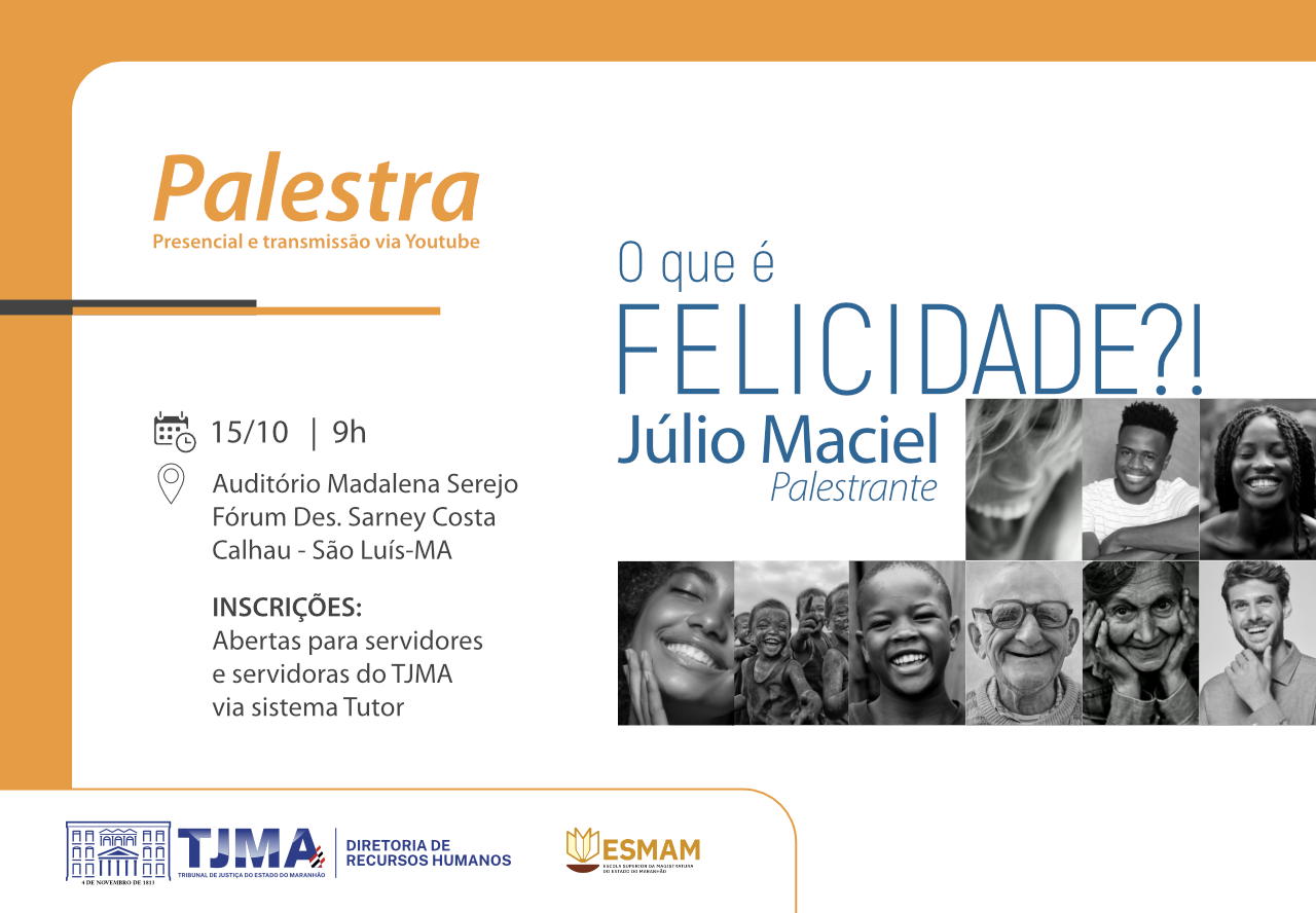 O Tribunal de Justiça do Maranhão (TJMA) promoverá no dia 15/10, às 9h, a palestra “O que é Felicidade?!”, conduzida pelo psicólogo Júlio Maciel. O encontro, que acontecerá no Auditório Madalena Serejo, no Fórum de São Luís (Calhau), será realizado de maneira híbrida (presencial e virtual) e terá certificado emitido pela Escola Superior da Magistratura do Maranhão (ESMAM). As inscrições estão abertas por meio da plataforma Tutor.