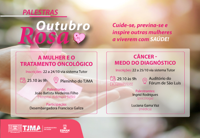 No segundo momento, haverá a palestra “Câncer - Medo do diagnóstico”, ministrada pela psicóloga Ingrid Fernandes Costa Rodrigues e pela médica Luciana Helena Gama Vaz, ambas da Divisão Médica do TJMA, que ocorrerá no auditório do Fórum de São Luís, no dia 29/10 às 9h. As inscrições estarão disponíveis de 22 a 25 de outubro, também pelo sistema Tutor. O evento será transmitido ao vivo pelo canal da ESMAM no YouTube e também terá certificação.
