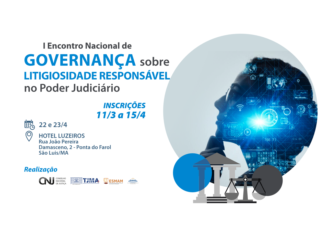 O I Encontro Nacional de Governança sobre Litigiosidade Responsável no Poder Judiciário será realizado nos dias 22 e 23 de abril, das 8h às 17h, no Hotel Luzeiros (Rua João Pereira Damasceno, n.2, Ponta do Farol). A iniciativa é promovida pelo Tribunal de Justiça do Maranhão (TJMA), em parceria com o Conselho Nacional de Justiça (CNJ), e reunirá magistrados/as, advogados/as, promotores/as, defensores/as públicos/as e demais operadores do Direito.