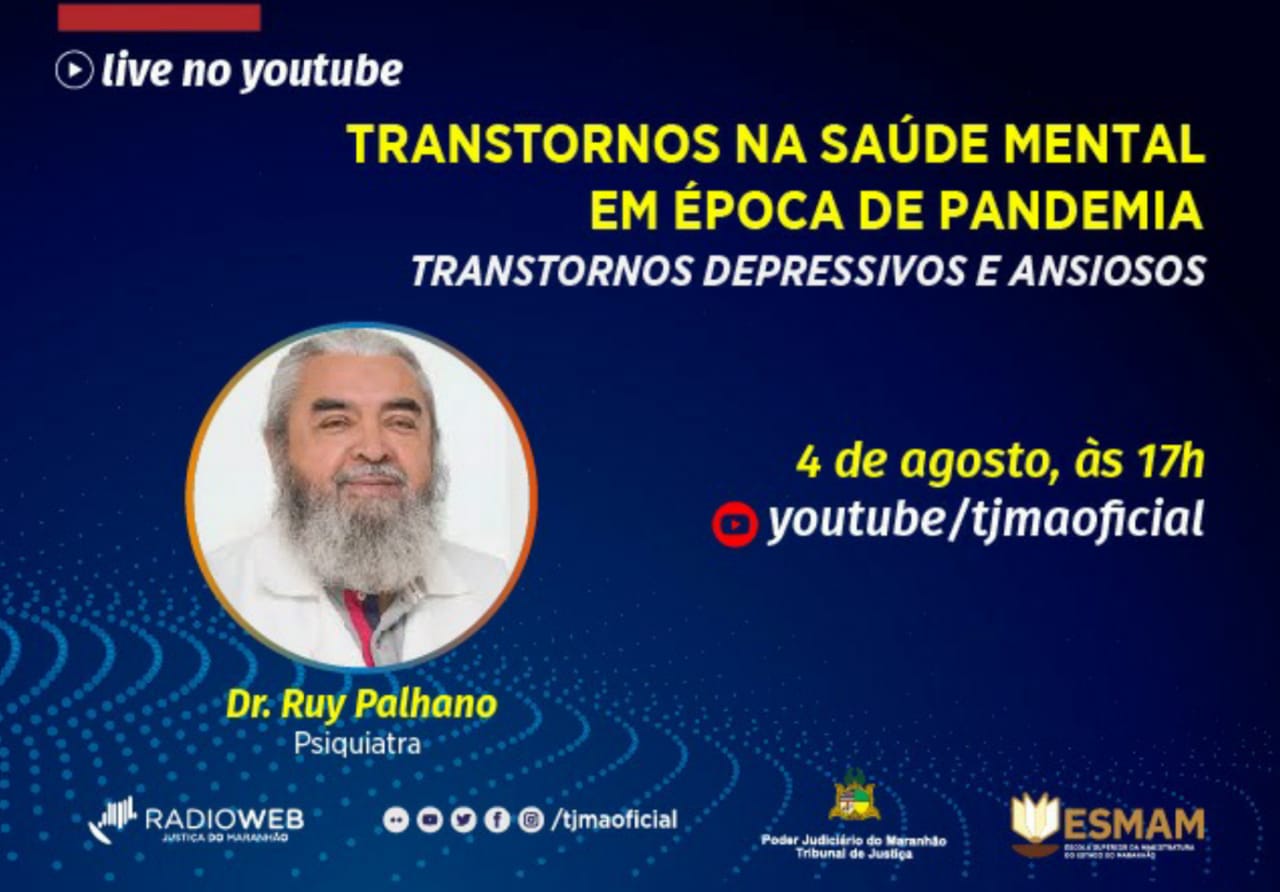 O Tribunal de Justiça do Maranhão (TJMA) promove na próxima terça-feira (4/8), às 17h, a palestra “Transtornos na Saúde Mental em Época de Pandemia” – com o subtema “Transtornos Depressivos e Ansiosos” – para magistrados e servidores do Poder Judiciário do Maranhão, a ser proferida pelo médico psiquiatra Ruy Palhano, pelo canal youtube/tjmaoficial.