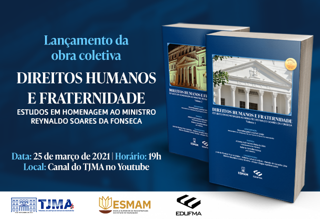O Tribunal de Justiça do Maranhão (TJMA), Escola Superior da Magistratura (ESMAM) e a Universidade Federal do Maranhão (UFMA) lançam no dia 25 de março, às 19 horas, o livro Direitos Humanos e Fraternidade: estudos em homenagem ao Ministro Reynaldo Soares da Fonseca. O lançamento terá transmissão pelo canal TJMA OFICIAL no Youtube.