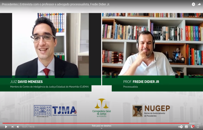 O advogado processualista e professor Fredie Didier Júnior, pós-doutor pela Universidade de Lisboa, foi entrevistado pelo juiz David Guimarães Meneses, integrante do Centro de Inteligência da Justiça Estadual do Maranhão (CIJEMA), na série de entrevistas gravadas em vídeo, produzida pelo Núcleo de Gerenciamento de Precedentes e de Ações Coletivas do Poder Judiciário (NUGEPNAC), divulgado nesta segunda-feira (17).