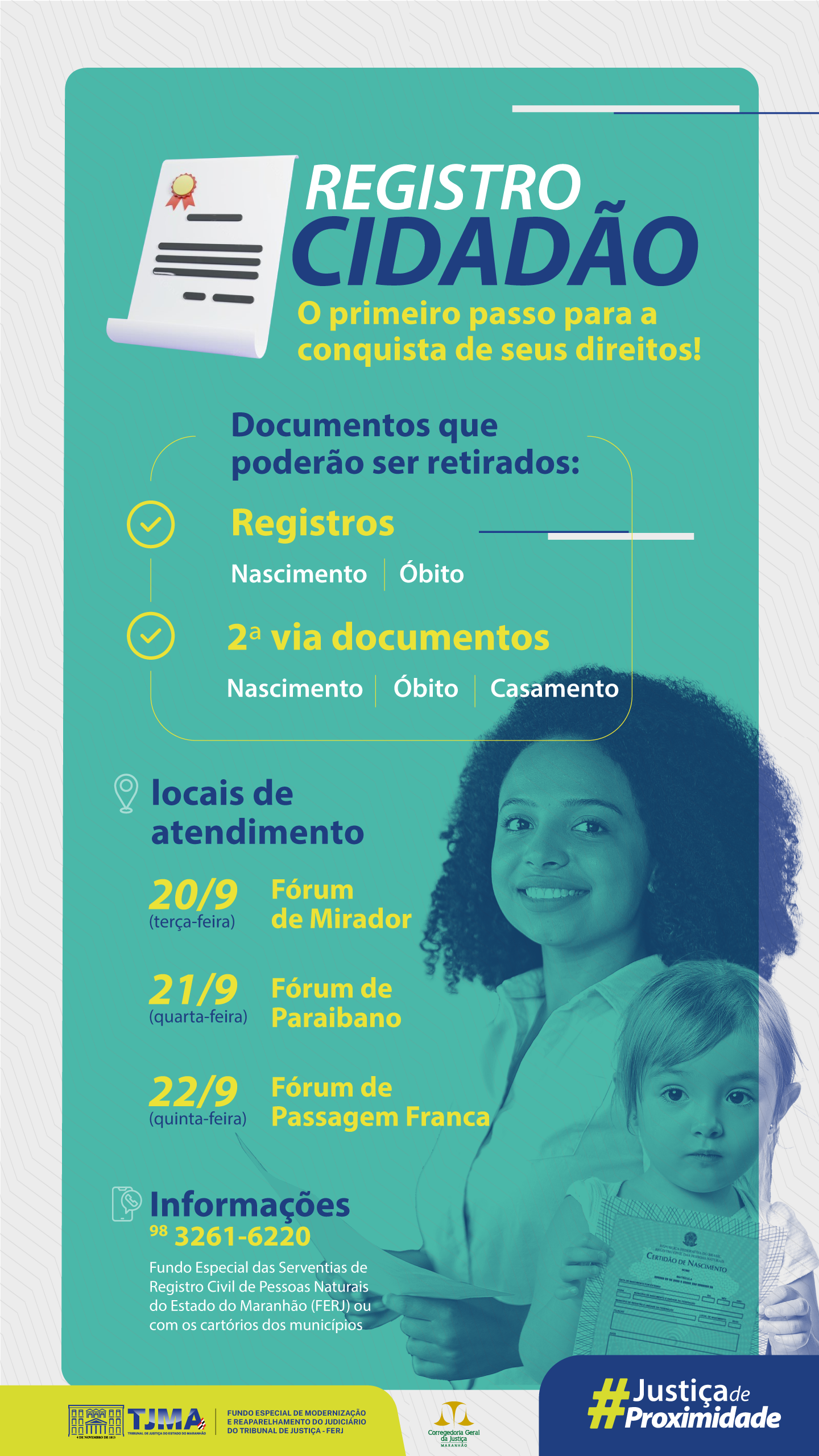 Com o objetivo de erradicar o sub-registro no Maranhão – sexto Estado do país com maior índice de sub-registro, segundo dados do Instituto Brasileiro de Geografia e Estatísticas, de 2017 – que o Poder Judiciário do Maranhão promoverá o projeto “Registro Cidadão”, nas comarcas de Mirador, nesta terça-feira (20/9), Paraibano (21/9) e Passagem Franca (22/9).