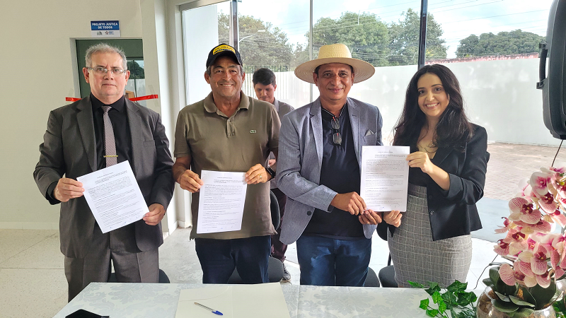 Autoridades exibem termo de cooperação assinado durante solenidade.