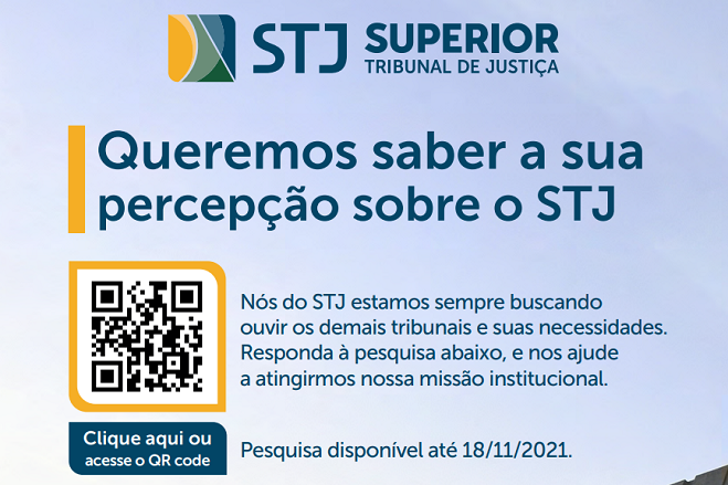 O Tribunal de Justiça do Maranhão (TJMA) informa que estão disponíveis os questionários da Pesquisa de Imagem do Superior Tribunal de Justiça (STJ), um projeto estratégico coordenado pela Ouvidoria da corte. A iniciativa busca aferir a percepção da sociedade sobre o STJ, também chamado de Tribunal da Cidadania: como ele é visto e o quanto é conhecido.