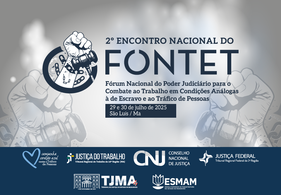 O 2º Encontro Nacional do Fórum Nacional do Poder Judiciário para Monitoramento e Efetividade das Demandas Relacionadas à Exploração do Trabalho em Condições Análogas à de Escravo e ao Tráfico de Pessoas (Fontet) será realizado nos dias 29 e 30 de julho, na Universidade Ceuma, no bairro Renascença, localizada na Rua Anapurus, 1, em São Luís. O evento promovido pelo Conselho Nacional de Justiça (CNJ), organizado em parceria com o Tribunal de Justiça do Maranhão (TJMA), Tribunal Regional do Trabalho (TRT – 16ª Região), Justiça Federal (TRF - 1ª Região), com apoio da Escola Superior da Magistratura do Maranhão (Esmam), está com inscrições abertas.
